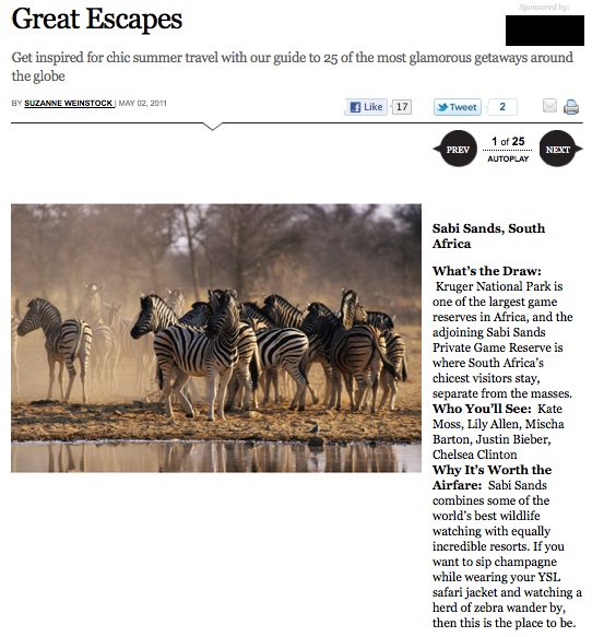 Elle: Great Escapes Share this: Click to share on X (Opens in new window) X Click to share on Facebook (Opens in new window) Facebook Like Loading... Related