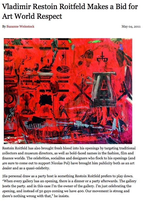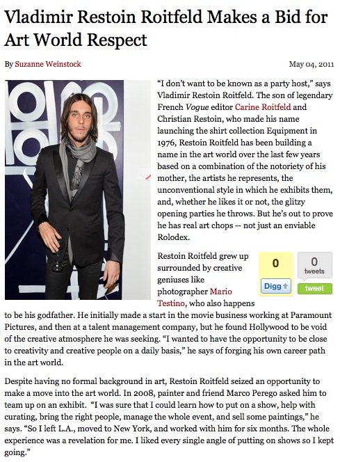 BlackBook: Vladimir Restoin Roitfeld Makes a Bid for Art World Respect Click HERE to read as a PDF Share this: Click to share on X (Opens in new window) X Click to share on Facebook (Opens in new window) Facebook Like Loading... Related